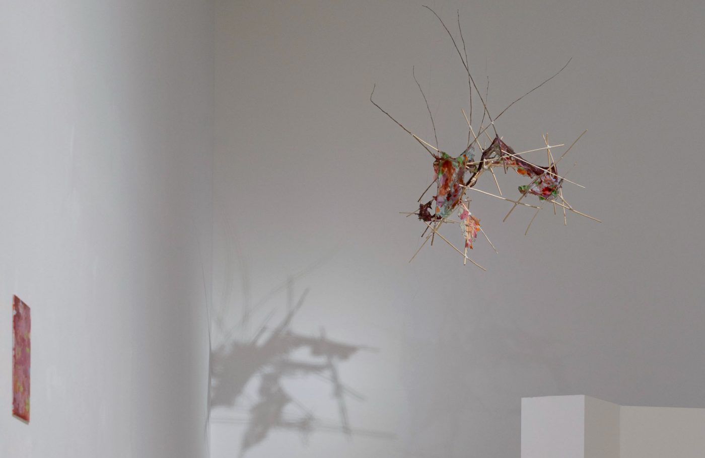 Esther Gatón’s artistic practice returns again and again to this eventful beginning: a sound before it becomes a word, an image so abstract it has not yet taken form; the instant prior to figuration. Working with materials such as bioplastic, textiles, and paper, Gatón gives her work physical presence without relying on substances that cannot return to organic matter. Her ethically attuned research leads her toward materials that can be cooked, burned, poured, prepared, and moulded, using kitchen-like processes to form the sculptures that hang from the ceiling, with a silent, almost kite-like lightness and mobility.